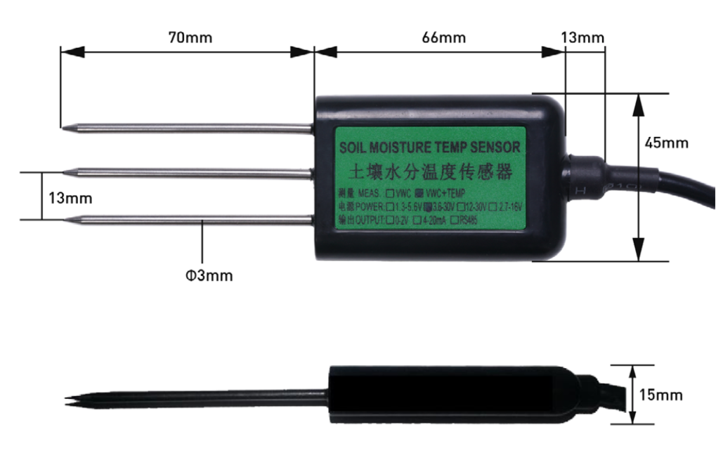 This Soil Moisture & Temperature Sensor comes with hook-up wires. It is designed with industry standards and incorporates two sensors (soil moisture sensor and soil temperature sensor) into one, featuring high precision and high sensitivity. By measuring the dielectric constant of the soil, it can stably measure the soil VWC (volumetric water content) regardless of various soil types. The measurement conforms to current international standards for soil moisture measurement.