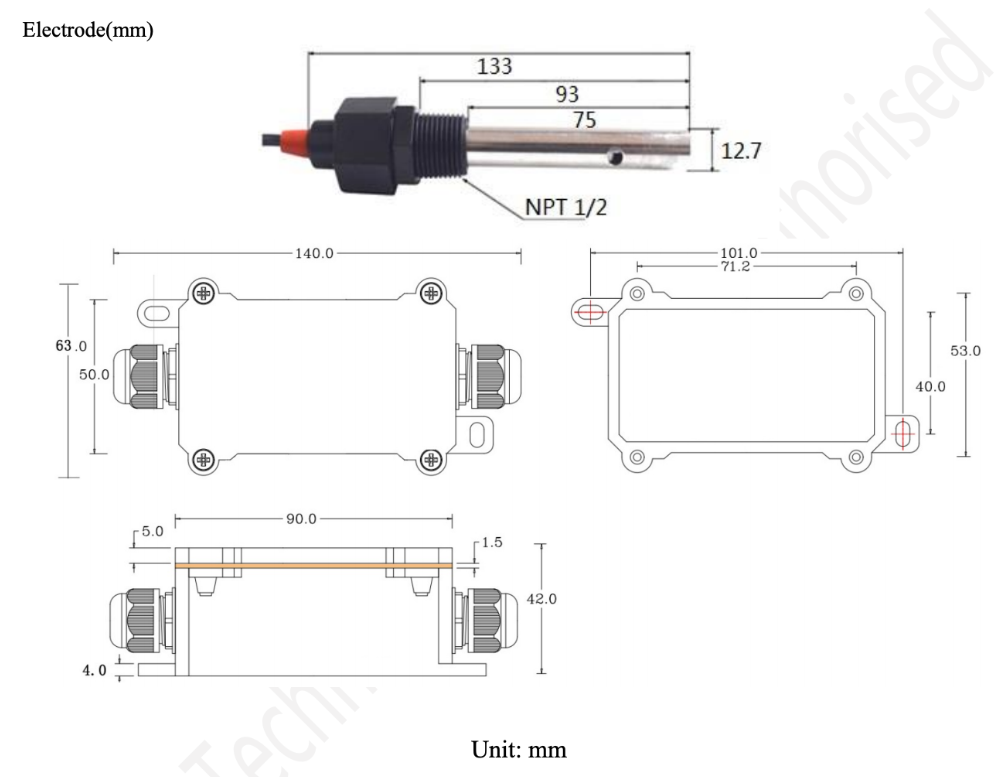 | Dimension | Electrode:1/2"NPT screw threads Transmitter:128*70*42mm | ||