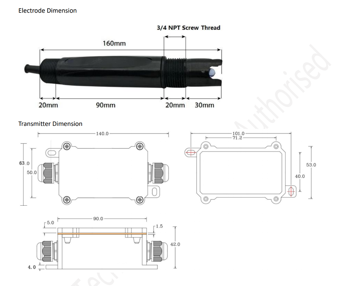 | Dimension | Electrode: Width*Diameter 160*30mm; 3/4"NPT screw threads Transmitter: 140mm*65mm*50mm | |