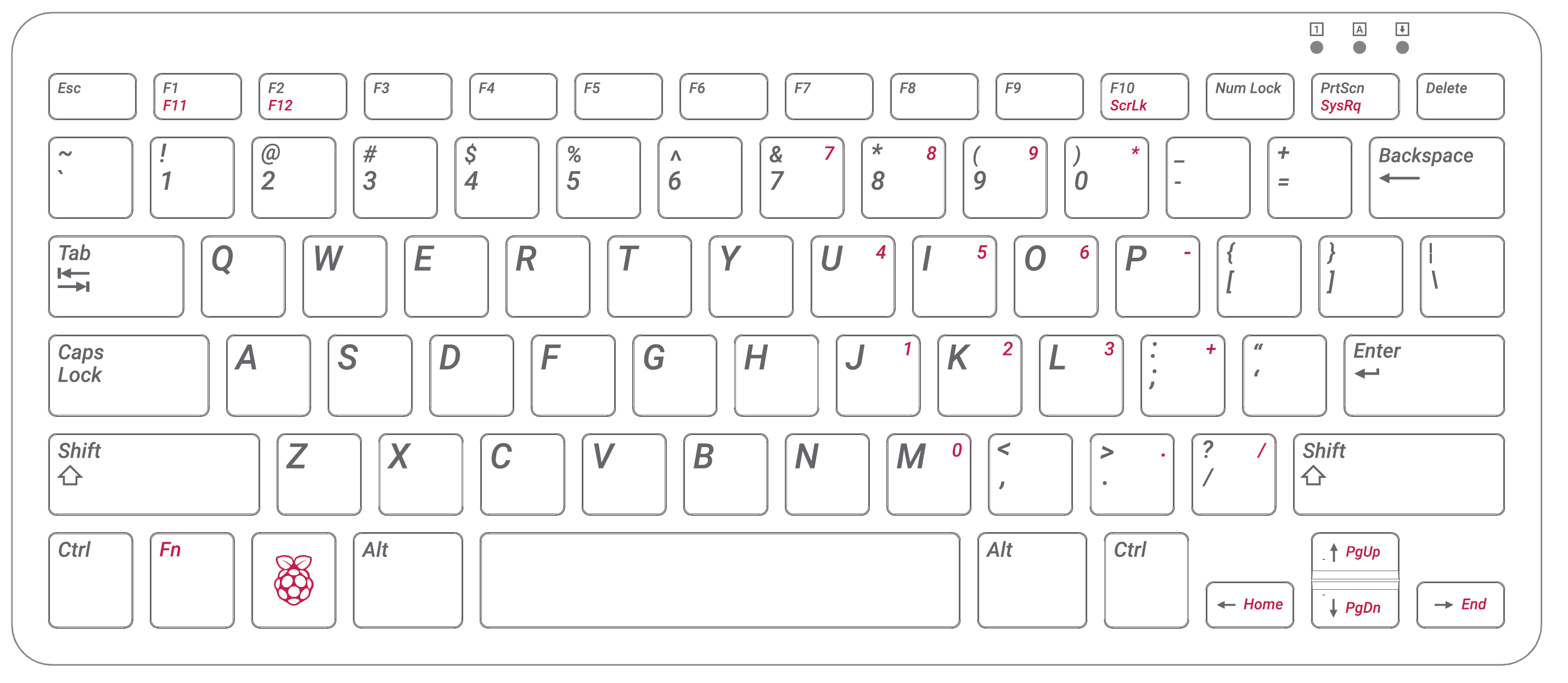 Raspberry Pi keyboard có 3 phím khóa: Num Lock, Scroll Lock và Caps Lock. Có ba đèn LED ở góc trên bên phải cho biết khóa nào được bật.