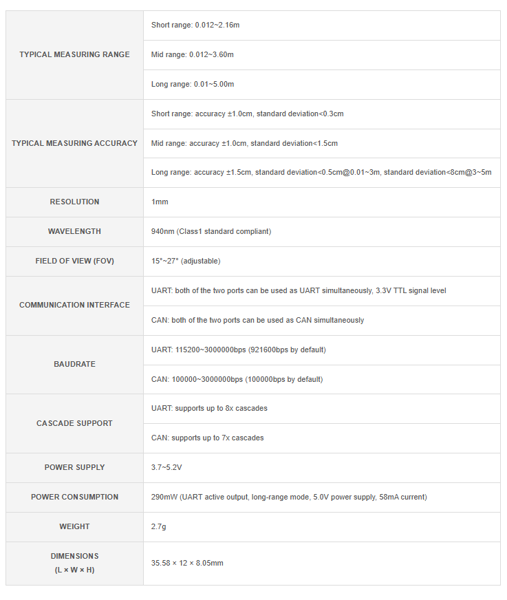 The TOF Laser Range Sensor is a TOF-based (time of flight) laser ranging sensor with embedded MCU and ranging algorithm, which is capable of offering up to 5m measuring range, ±1.5cm accuracy, and 1mm resolution. It supports cascade ranging via UART or CAN bus, configurable data output including active output and query output.
