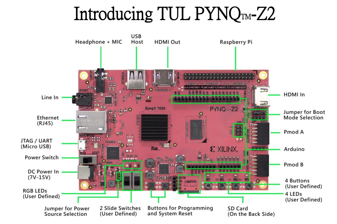 TUL PYNQ™-Z2 board, based on Xilinx Zynq SoC, is designed for the Xilinx University Program to support PYNQ (Python Productivity for Zynq) framework (please refer to the PYNQ project webpage at www.pynq.io) and embedded systems development.